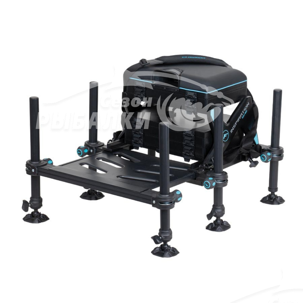 К мощному каркасу платформы крепятся покрытое эко-кожей полумягкое сиденье с фиксатором под удилище и ящик 47х36х6 см. Внизу установлены три съемных модуля высотой 6, 4 и 2 см. Надежный фиксатор не позволяет модулям самопроизвольно выдвигаться. В конструкции модулей использованы специальные защелки-шарниры, которые дают возможность открывать крышку модуля с двух сторон, а также снять/присоединить отдельно взятый модуль. На задней части рамы размещен уровень, а замки ног оборудованы фирменными фиксаторами с логотипом компании.