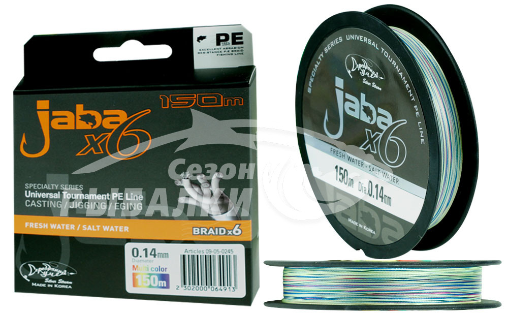 Jaba X6 - PE шнур плетением в 6 нитей. Редкий тип плетения, являющейся отличной альтернативой по качеству шнурам 8 нитей, и при этом значительно бюджетней. Плетение 6 нитей применяется крайне редко, но шнуры с данным плетением значительно выше качеством, обладают лучшими рабочими характеристиками чем шнуры плетением 4 нити, и существенно дешевле шнуров плетением 8 нитей. 6 нитей плетения позволяют делать более тонкие шнуры, относительно 8 нитей и поэтому у модели Jaba X6 есть шнур с толщиной 0.05 мм, что составляет редкие 0.1 PE. Высокомодульный полиэтилен (PE) с плетением 6 нитей, малошумный и устойчивый к износу из- за равномерного распределения волокон в плетении. В новой программе добавлен цвет "радуга" со сменой цвета каждые 10 метров, что очень удобно для контроля дальности заброса, точного определения дистанции поклевки и фиксации места стоянки хищника.