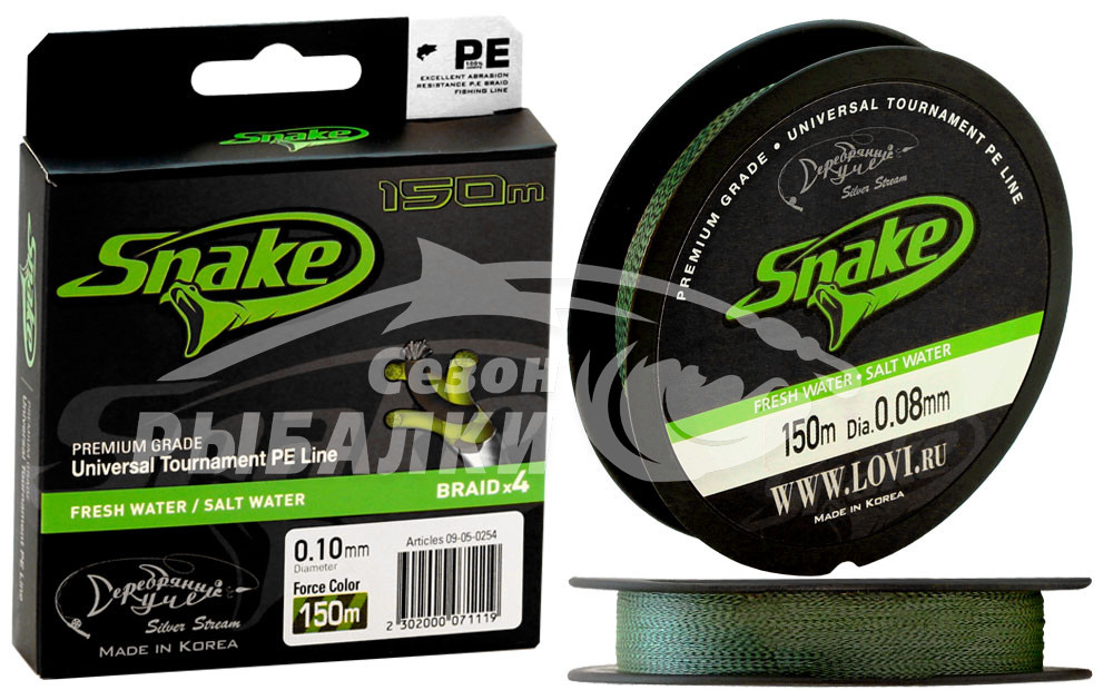 - Плетёный шнур Серебряный ручей SNAKE X 4 FORCE COLOR Line SLx4-14BFG 150м 0.14мм black&F/green
