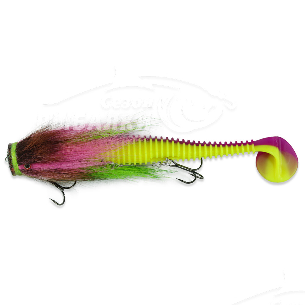 Бактейл с виброхвостом длинною 22см и весом 65 грамм. Уловистая приманка для ловли трофейного хищника. Пышная юбка из оленьего меха придает объемную форму в воде, а крупный пятачок создает мощный ток воды вокруг себя, благодаря чему приманка заметна с достаточно большого расстояния. Силиконовый хвост, легко заводится и при необходимости быстро меняется. Невероятная игра бактейла даже на медленных проводках и паузах, действует на хищника как магнит.