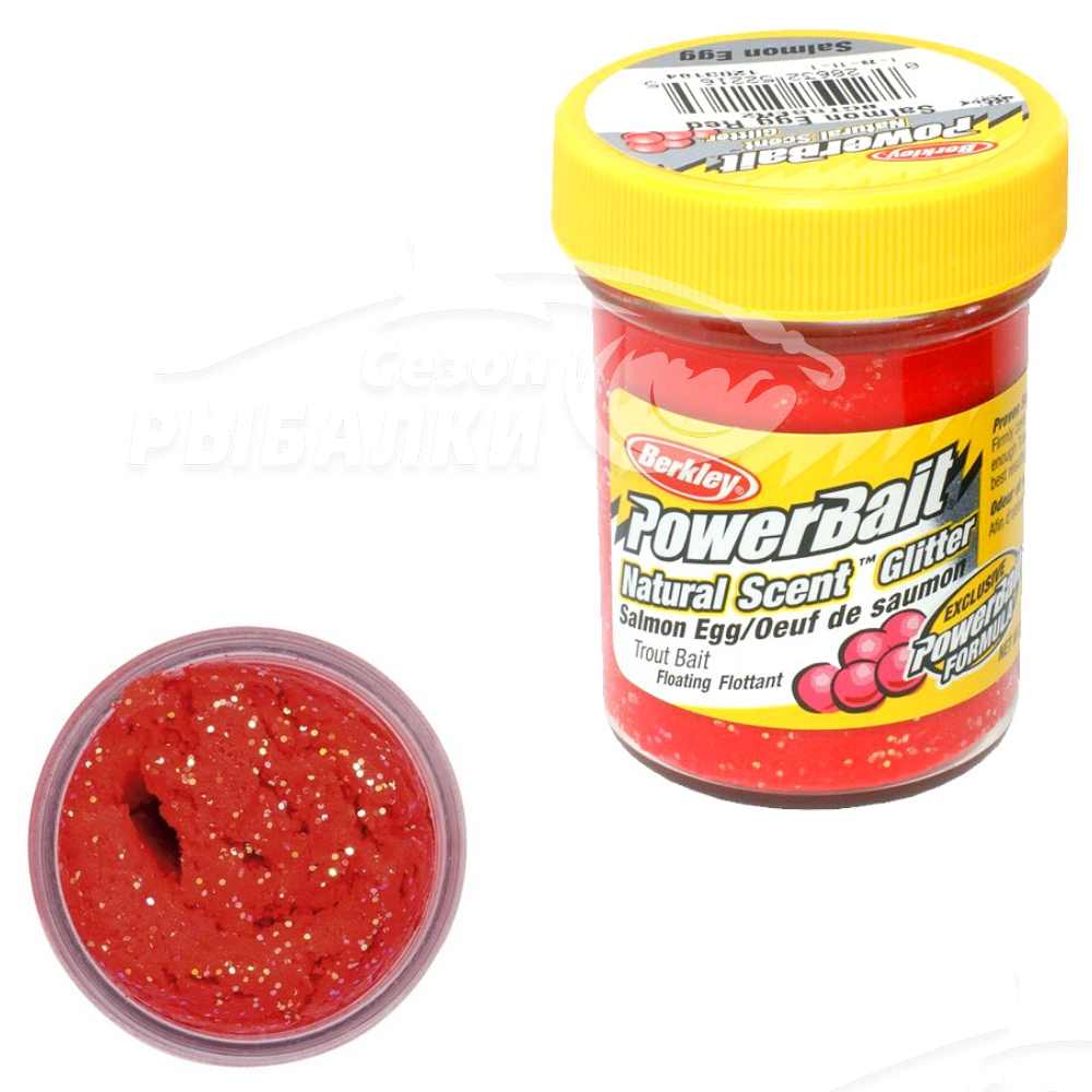 Powerbait Natural Scent Glitter Trout Bait Salmon Egg Red Glitter - паста, имеющая натуральный аромат, специально разработана для ловли хищной рыбы. Приманка обладает запахом и вкусом (чеснока, икры, сыра), что делает ее еще более похожей на настоящую наживку. Имеет способность отражать свет, за счет чего значительно повышает видимость, что очень важно в темное время суток и при ловле в мутной воде. Преимущественно, при редкой поклевке, рыба лучше откликается на знакомый и привычный для нее корм, например, лососевую икру.