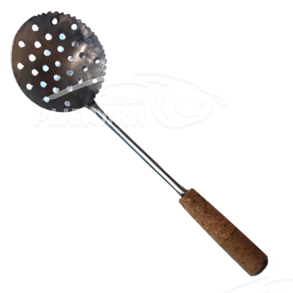 Надёжная и качесвенно изготовленная шумовка-черпак, для зимней рыбалки. Черпак для зимней рыбалки ручной, из нержавеющей стали с надёжной пайкой самой ложки к ручке, которая изготовлена из пробки. Данной шумовкой можно отбивать образовавшийся лёд в лунках или с ледобура, не боясь что развалится. Так как данная шумовка ручной работы, размеры в описании товара и фактические, могут незначительно отличаться.