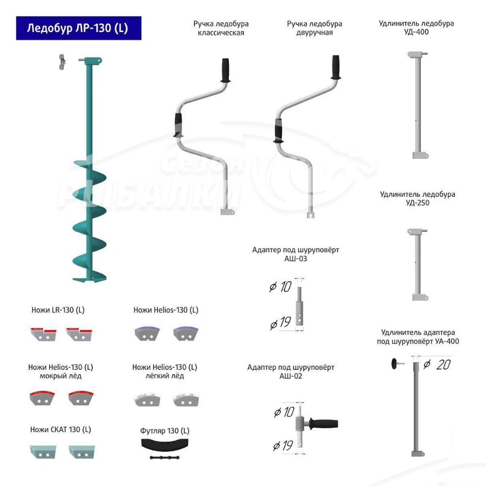 Если вы живете в районах, где глубина льда два и более метра то эта модель вам тоже подойдет. Глубину бурения можно увеличить добавив удлинители УД-400 или УД-250. В зависимости на какую глубину вам нужно увеличить, удлинители могут собираться в любой последовательности между собой и крепится к буру.