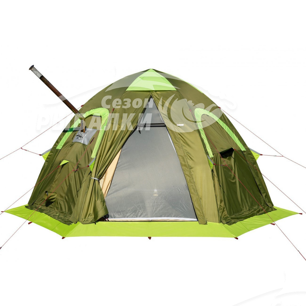 Четыре стенки шестигранной конструкции автоматической палатки оснащены входами с противомоскитными сетками, установленными на внутреннем тенте, и окнами с системами эффективной вентиляции. В одном из входов встроена универсальная двухслойная система установки отопительной печи, позволяющая установить в палатке печь любого типоразмера.